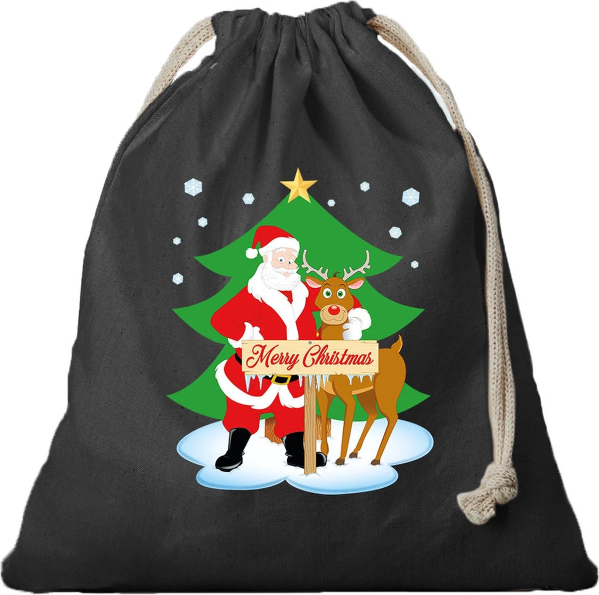 1x Sac Cadeau Noël Père Noël Et Rudolf Noir Avec Cordon De Serrage – Sac En Coton / Jute – Sacs D’emballage Cadeau De Noël