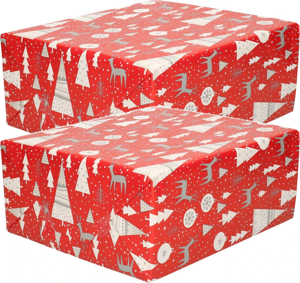 2x Rouleaux De Papier Cadeau/papier Cadeau De Noël Rouge Avec Des Sapins De Noël 200 X 70 Cm – Rouleaux De Papier Cadeau De Noël