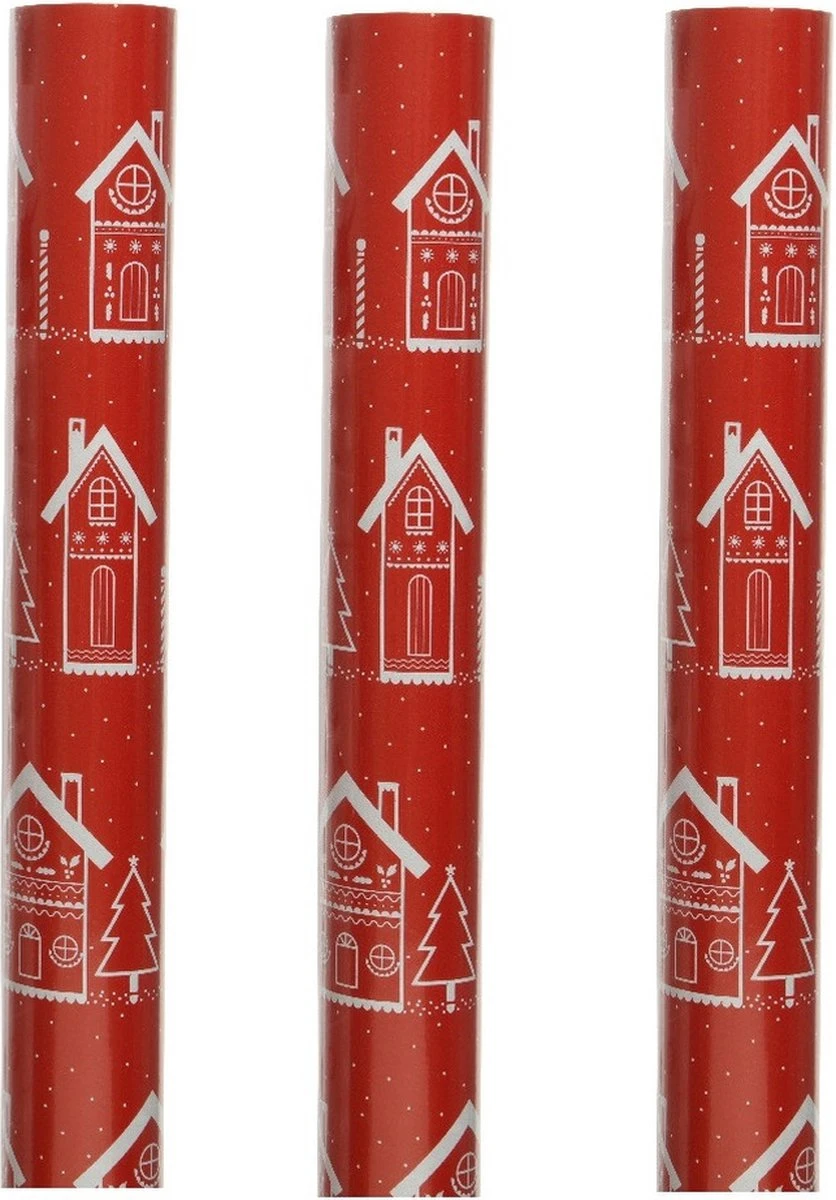 3x rouleaux de papier cadeau/papier cadeau de Noël rouge avec des maisons 200 x 70 cm. Emballage de cadeaux de Noël/cadeaux de Noël rouleaux de papier d’emballage.