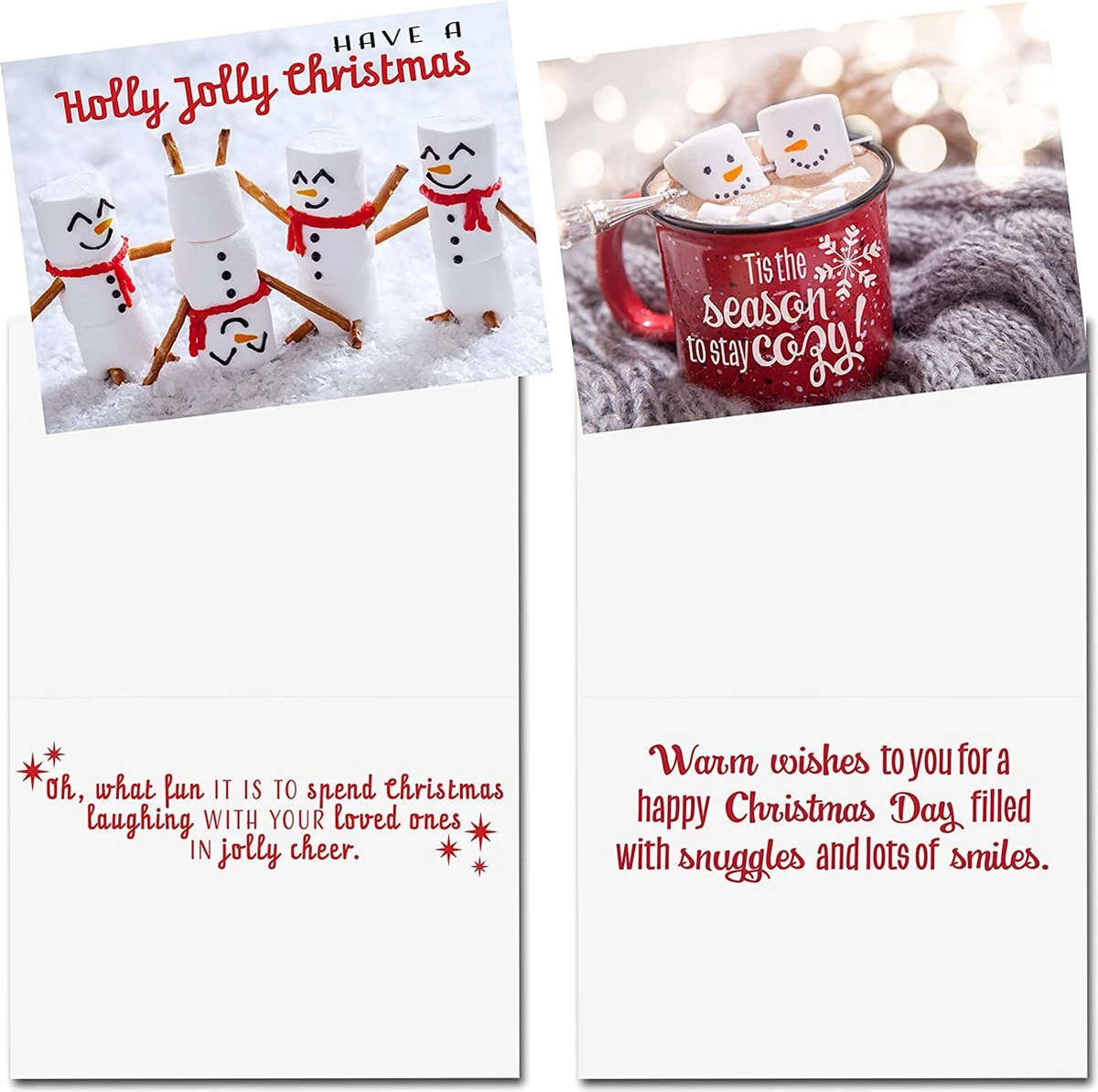 - UNIQUE ET FESTIF. Ces Cartes de vœux de vacances présentent des illustrations élégantes d’adorables animaux qui ne manqueront pas d’attirer et de réchauffer le cœur du destinataire et du donneur. Un mélange d’animaux doux? charme avec la sensation chaleureuse et floue de Noël. Un précieux achat de carte de Noël pour la période des fêtes !