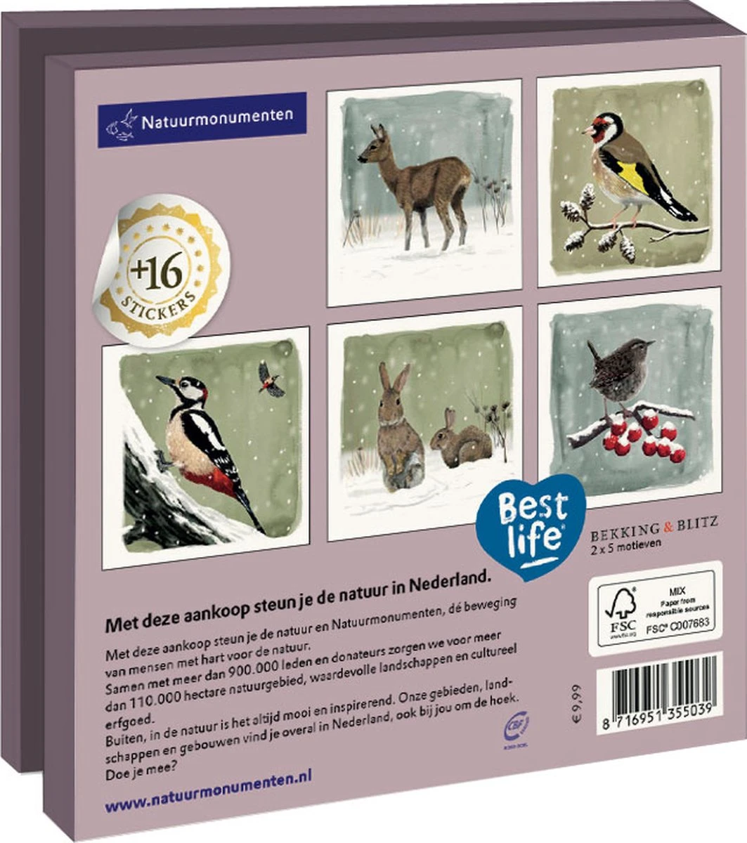Dix cartes doubles (2 x 5 motifs différents) ou 10 cartes différentes avec 10 enveloppes luxueuses, soigneusement rangées dans une jolie pochette à cartes. Les différents motifs sont représentés au dos du dossier. De cette façon, vous pouvez trouver rapidement la carte dont vous avez besoin. L’intérieur des cartes en double est vierge. Il y a donc beaucoup de place pour votre message personnel.