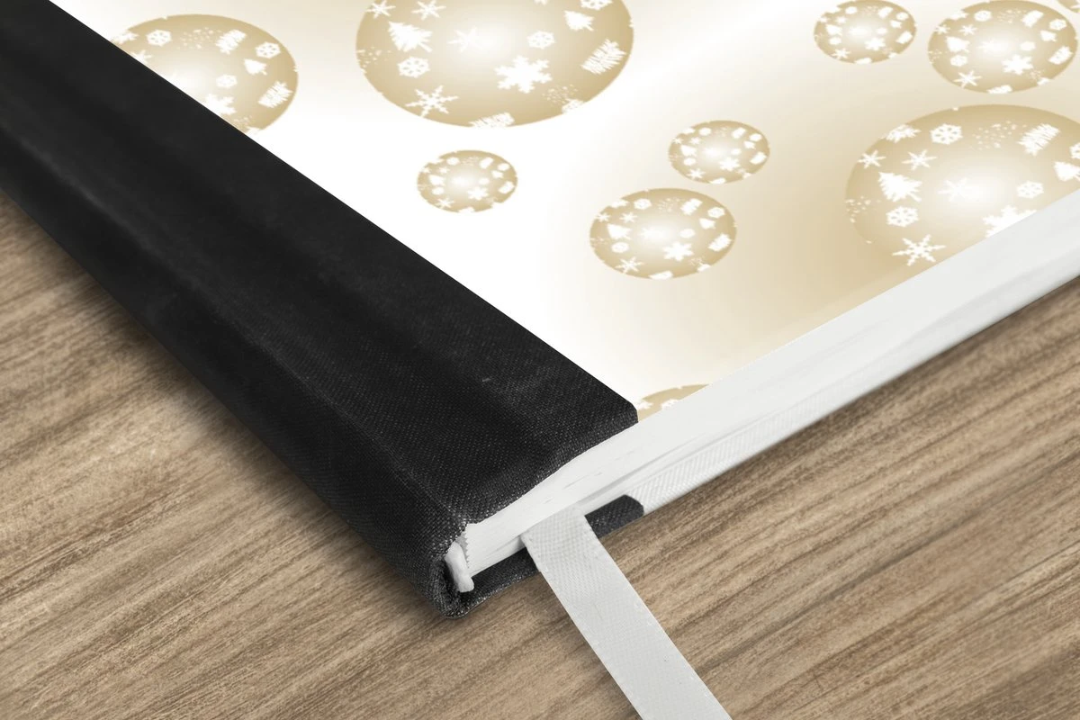 Le bloc -notes a une couverture rigide et est fini avec une reliure noire. Cette reliure a un aspect daim, ce qui lui donne un aspect luxueux. En raison de la reliure noire, le carnet a un dos partiellement noir. En raison de sa taille compacte, le carnet à couverture rigide est facile à transporter.