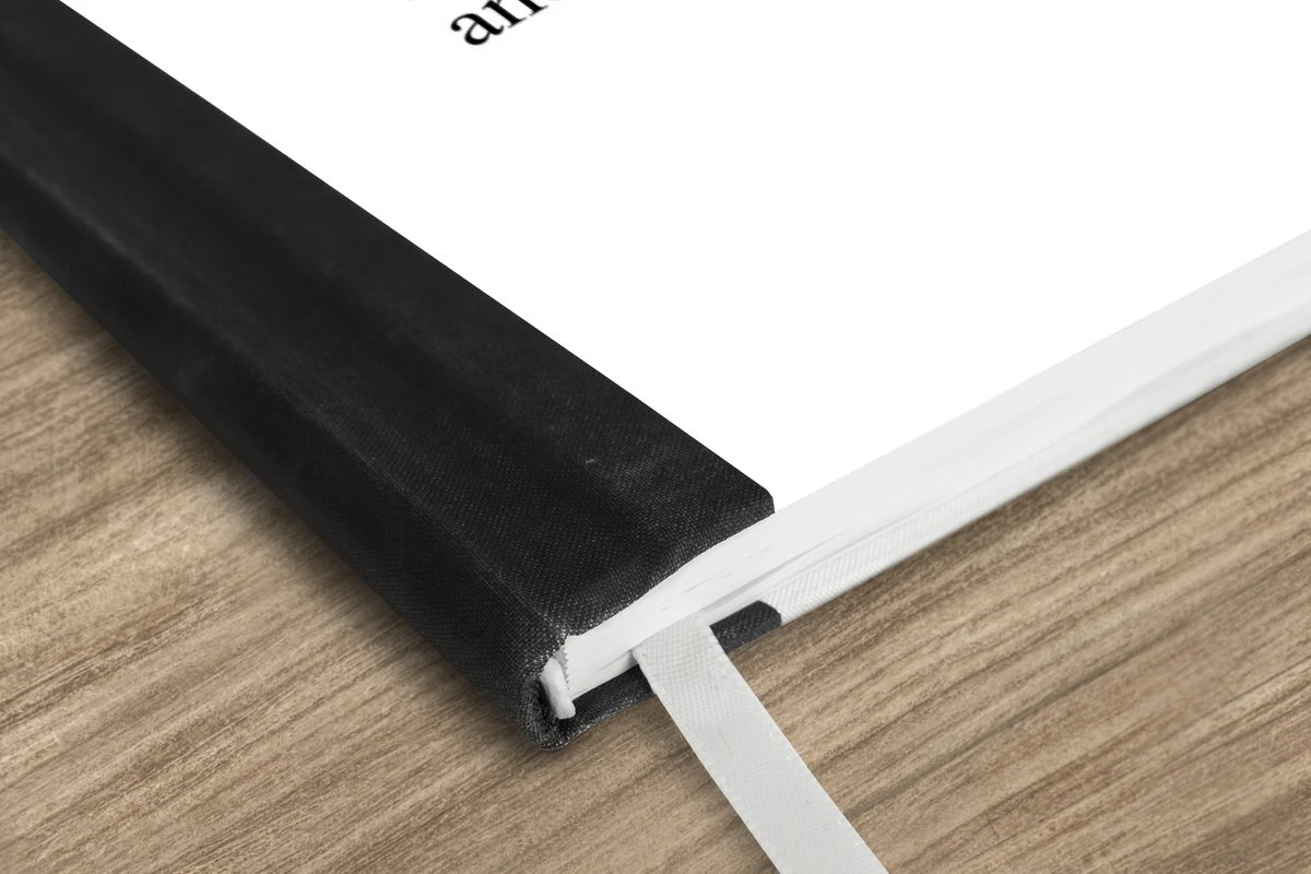 Le bloc -notes a une couverture rigide et est fini avec une reliure noire. Cette reliure a un aspect daim, ce qui lui donne un aspect luxueux. En raison de la reliure noire, le carnet a un dos partiellement noir. En raison de sa taille compacte, le carnet à couverture rigide est facile à transporter.