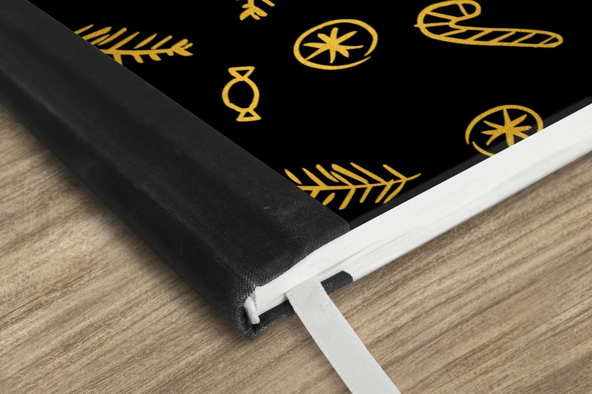 Le bloc -notes a une couverture rigide et est fini avec une reliure noire. Cette reliure a un aspect daim, ce qui lui donne un aspect luxueux. En raison de la reliure noire, le carnet a un dos partiellement noir. En raison de sa taille compacte, le carnet à couverture rigide est facile à transporter.