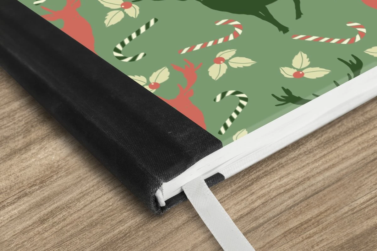 Le bloc -notes a une couverture rigide et est fini avec une reliure noire. Cette reliure a un aspect daim, ce qui lui donne un aspect luxueux. En raison de la reliure noire, le carnet a un dos partiellement noir. En raison de sa taille compacte, le carnet à couverture rigide est facile à transporter.