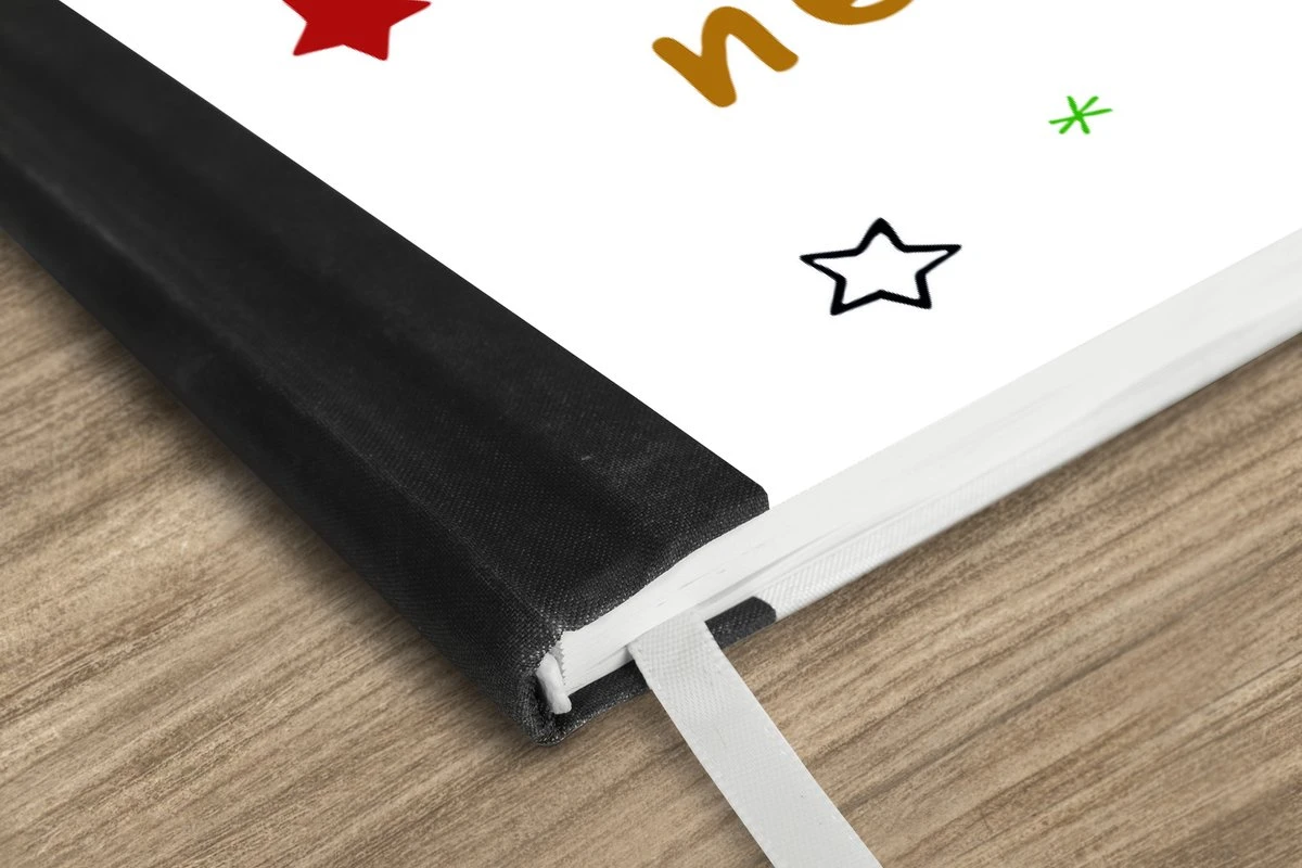 Le bloc -notes a une couverture rigide et est fini avec une reliure noire. Cette reliure a un aspect daim, ce qui lui donne un aspect luxueux. En raison de la reliure noire, le carnet a un dos partiellement noir. En raison de sa taille compacte, le carnet à couverture rigide est facile à transporter.