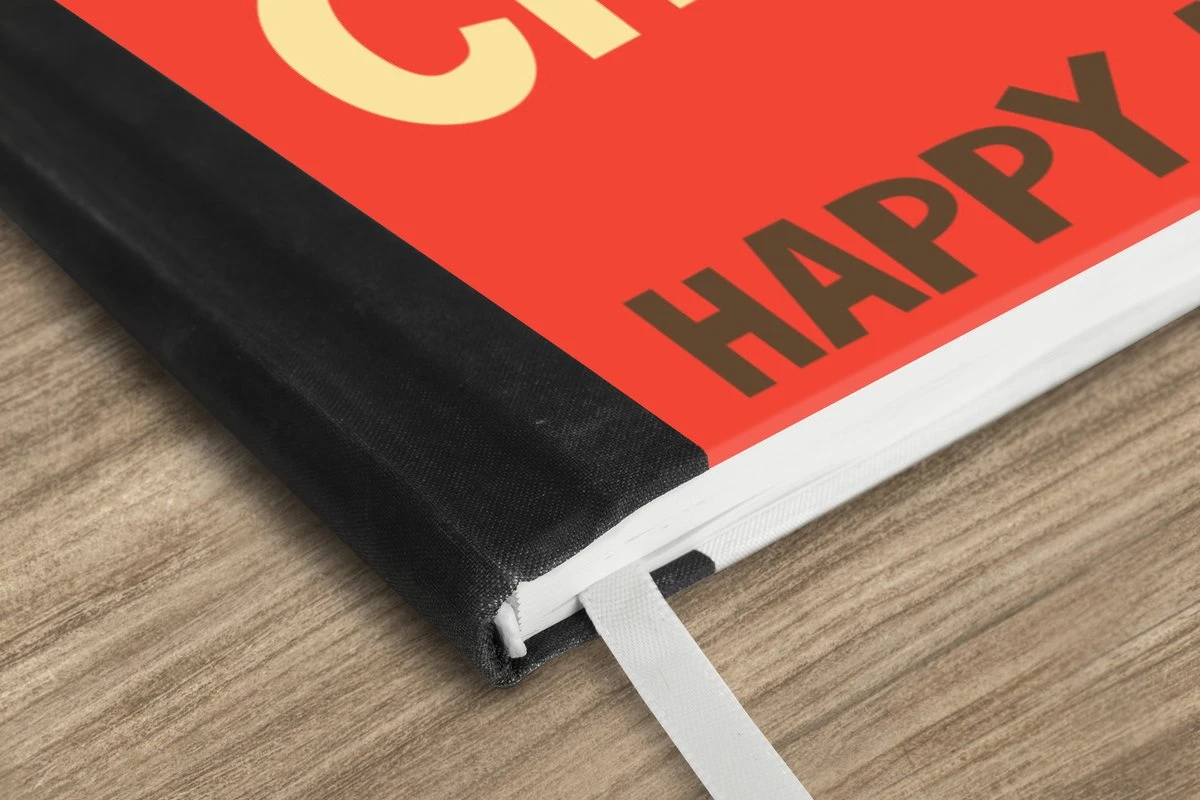 Le bloc -notes a une couverture rigide et est fini avec une reliure noire. Cette reliure a un aspect daim, ce qui lui donne un aspect luxueux. En raison de la reliure noire, le carnet a un dos partiellement noir. En raison de sa taille compacte, le carnet à couverture rigide est facile à transporter.