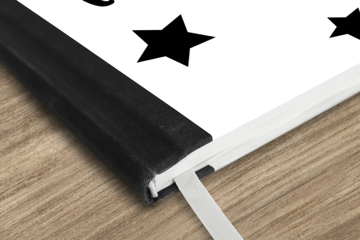 Le bloc -notes a une couverture rigide et est fini avec une reliure noire. Cette reliure a un aspect daim, ce qui lui donne un aspect luxueux. En raison de la reliure noire, le carnet a un dos partiellement noir. En raison de sa taille compacte, le carnet à couverture rigide est facile à transporter.