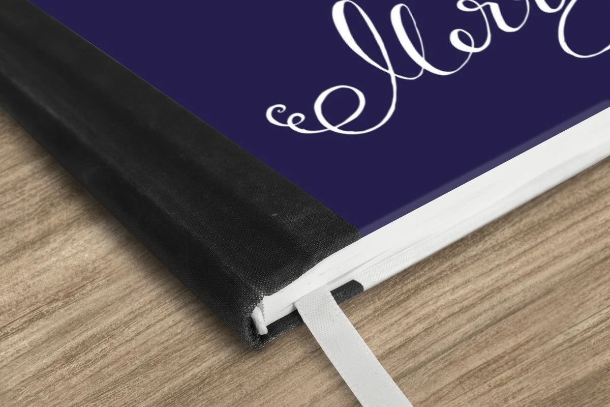 Le bloc -notes a une couverture rigide et est fini avec une reliure noire. Cette reliure a un aspect daim, ce qui lui donne un aspect luxueux. En raison de la reliure noire, le carnet a un dos partiellement noir. En raison de sa taille compacte, le carnet à couverture rigide est facile à transporter.