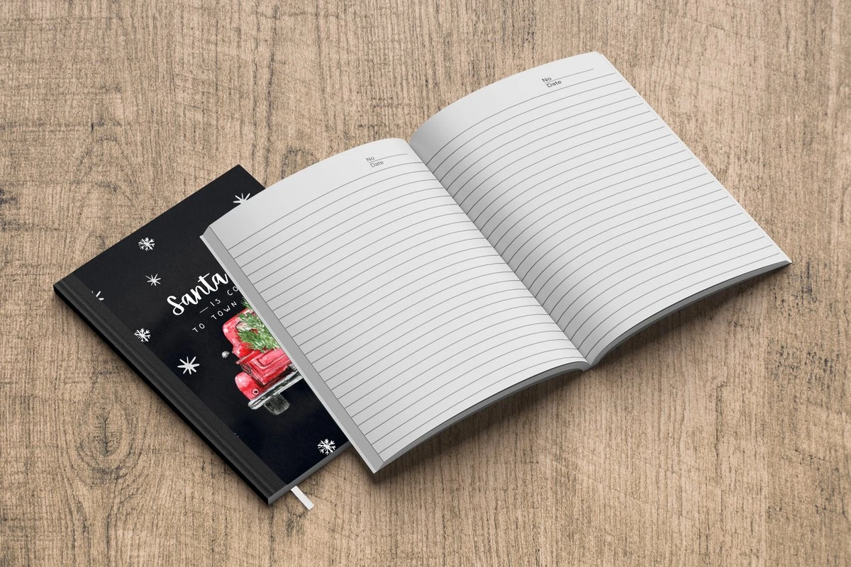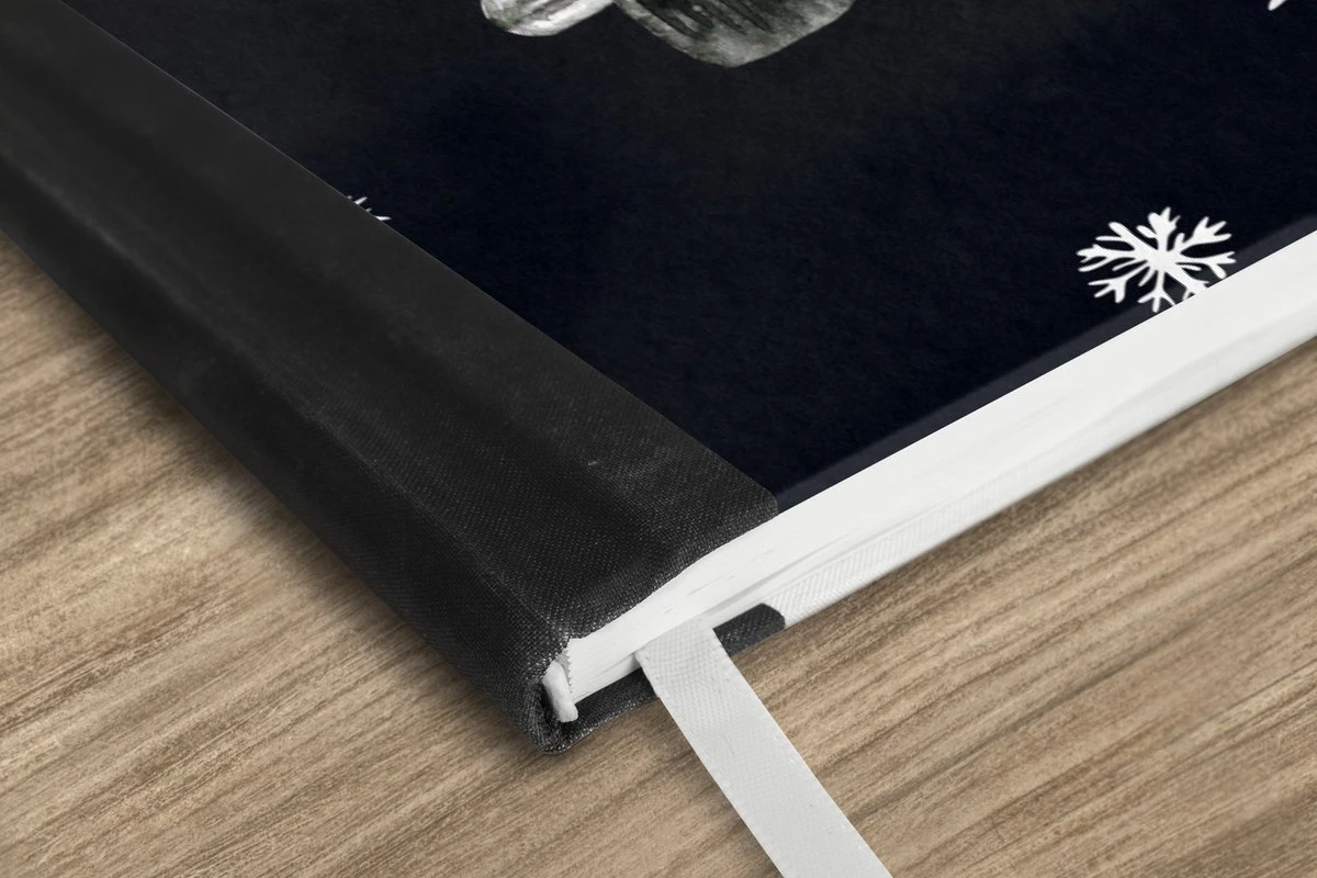 Le bloc -notes a une couverture rigide et est fini avec une reliure noire. Cette reliure a un aspect daim, ce qui lui donne un aspect luxueux. En raison de la reliure noire, le carnet a un dos partiellement noir. En raison de sa taille compacte, le carnet à couverture rigide est facile à transporter.