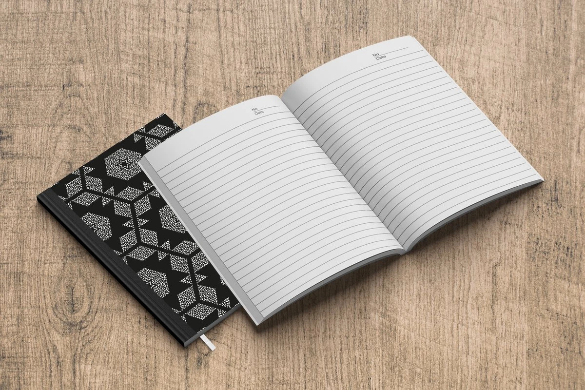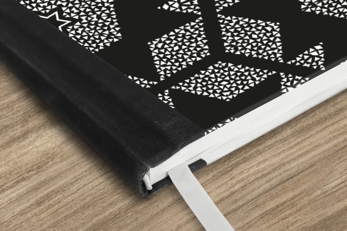 Le bloc -notes a une couverture rigide et est fini avec une reliure noire. Cette reliure a un aspect daim, ce qui lui donne un aspect luxueux. En raison de la reliure noire, le carnet a un dos partiellement noir. En raison de sa taille compacte, le carnet à couverture rigide est facile à transporter.