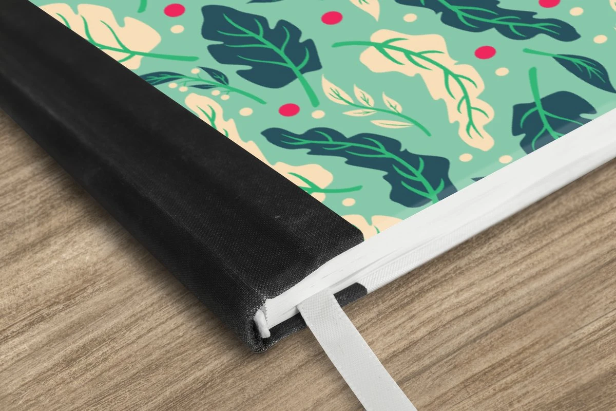 Le bloc -notes a une couverture rigide et est fini avec une reliure noire. Cette reliure a un aspect daim, ce qui lui donne un aspect luxueux. En raison de la reliure noire, le carnet a un dos partiellement noir. En raison de sa taille compacte, le carnet à couverture rigide est facile à transporter.