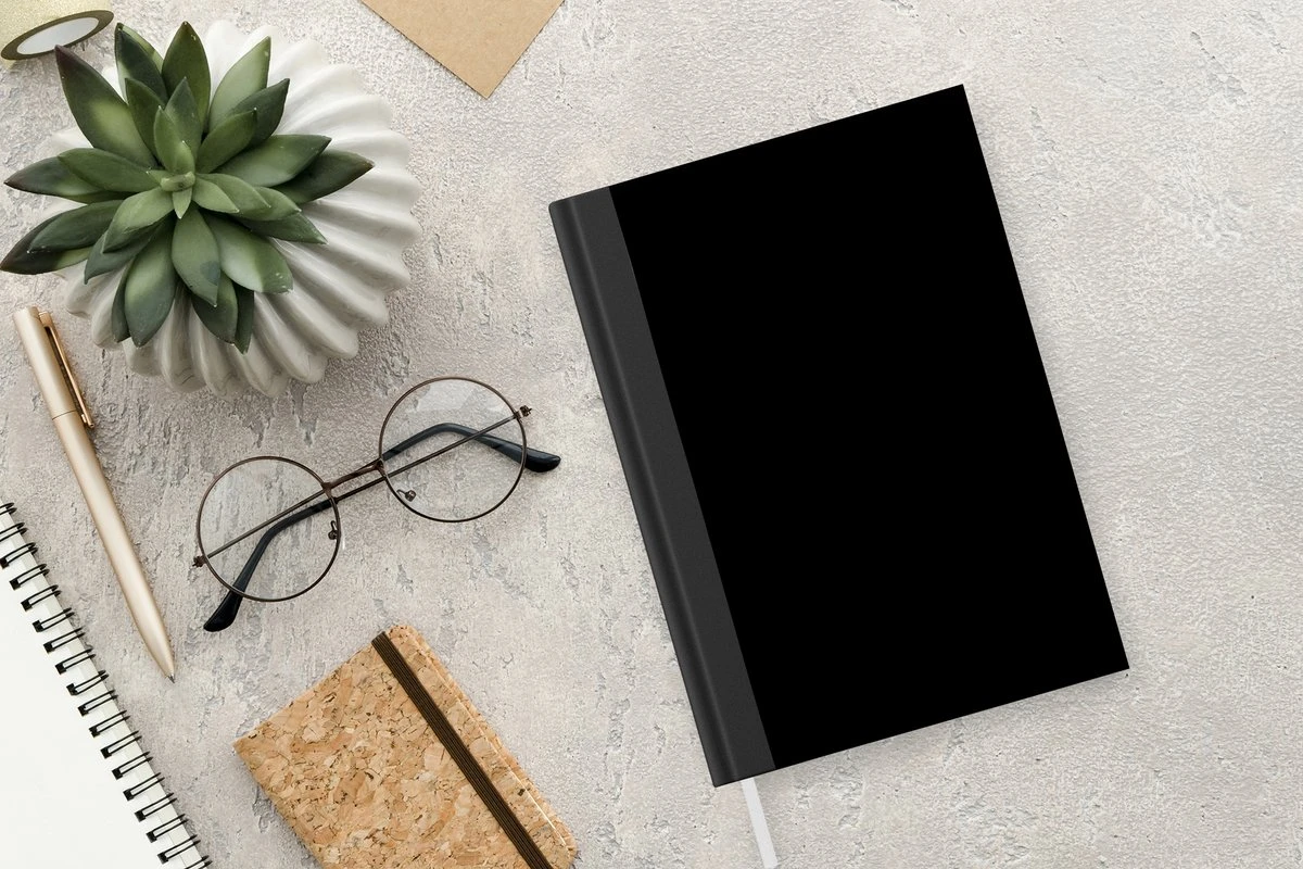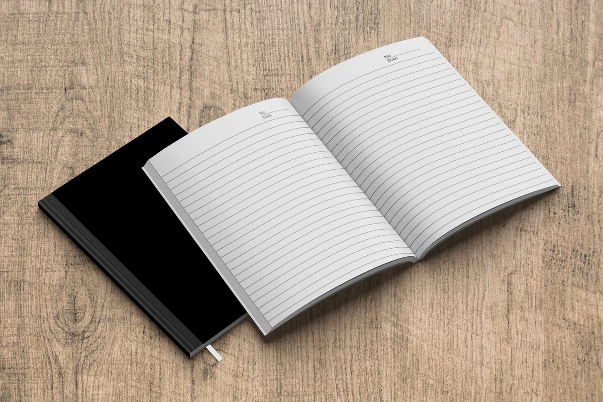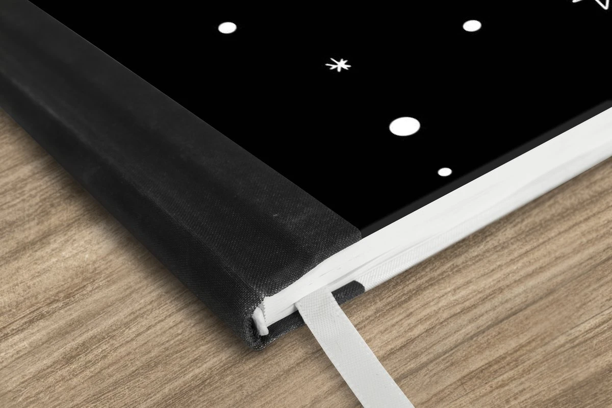 Le bloc -notes a une couverture rigide et est fini avec une reliure noire. Cette reliure a un aspect daim, ce qui lui donne un aspect luxueux. En raison de la reliure noire, le carnet a un dos partiellement noir. En raison de sa taille compacte, le carnet à couverture rigide est facile à transporter.