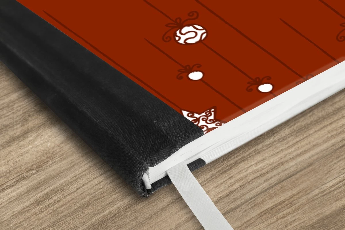 Le bloc -notes a une couverture rigide et est fini avec une reliure noire. Cette reliure a un aspect daim, ce qui lui donne un aspect luxueux. En raison de la reliure noire, le carnet a un dos partiellement noir. En raison de sa taille compacte, le carnet à couverture rigide est facile à transporter.