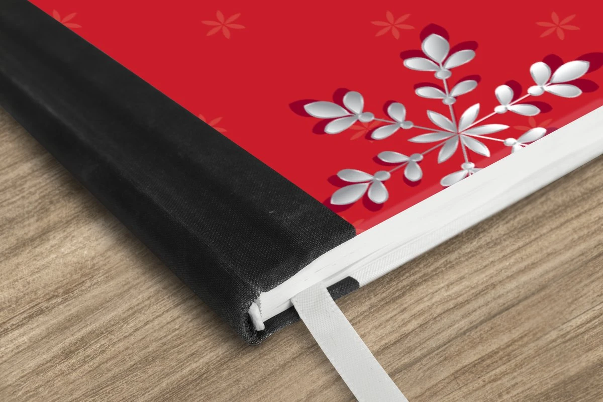 Le bloc -notes a une couverture rigide et est fini avec une reliure noire. Cette reliure a un aspect daim, ce qui lui donne un aspect luxueux. En raison de la reliure noire, le carnet a un dos partiellement noir. En raison de sa taille compacte, le carnet à couverture rigide est facile à transporter.