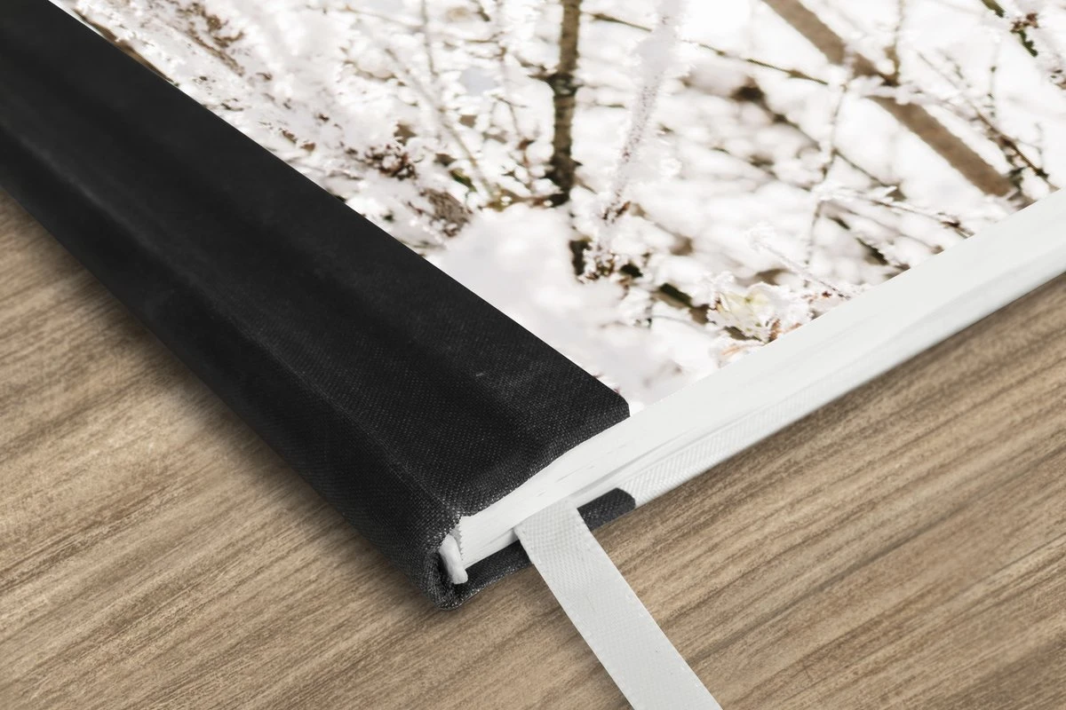 Le bloc -notes a une couverture rigide et est fini avec une reliure noire. Cette reliure a un aspect daim, ce qui lui donne un aspect luxueux. En raison de la reliure noire, le carnet a un dos partiellement noir. En raison de sa taille compacte, le carnet à couverture rigide est facile à transporter.