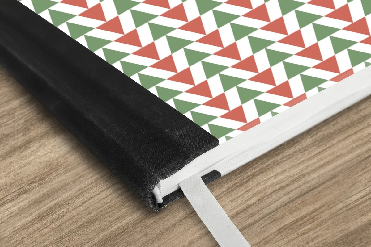 Le bloc -notes a une couverture rigide et est fini avec une reliure noire. Cette reliure a un aspect daim, ce qui lui donne un aspect luxueux. En raison de la reliure noire, le carnet a un dos partiellement noir. En raison de sa taille compacte, le carnet à couverture rigide est facile à transporter.