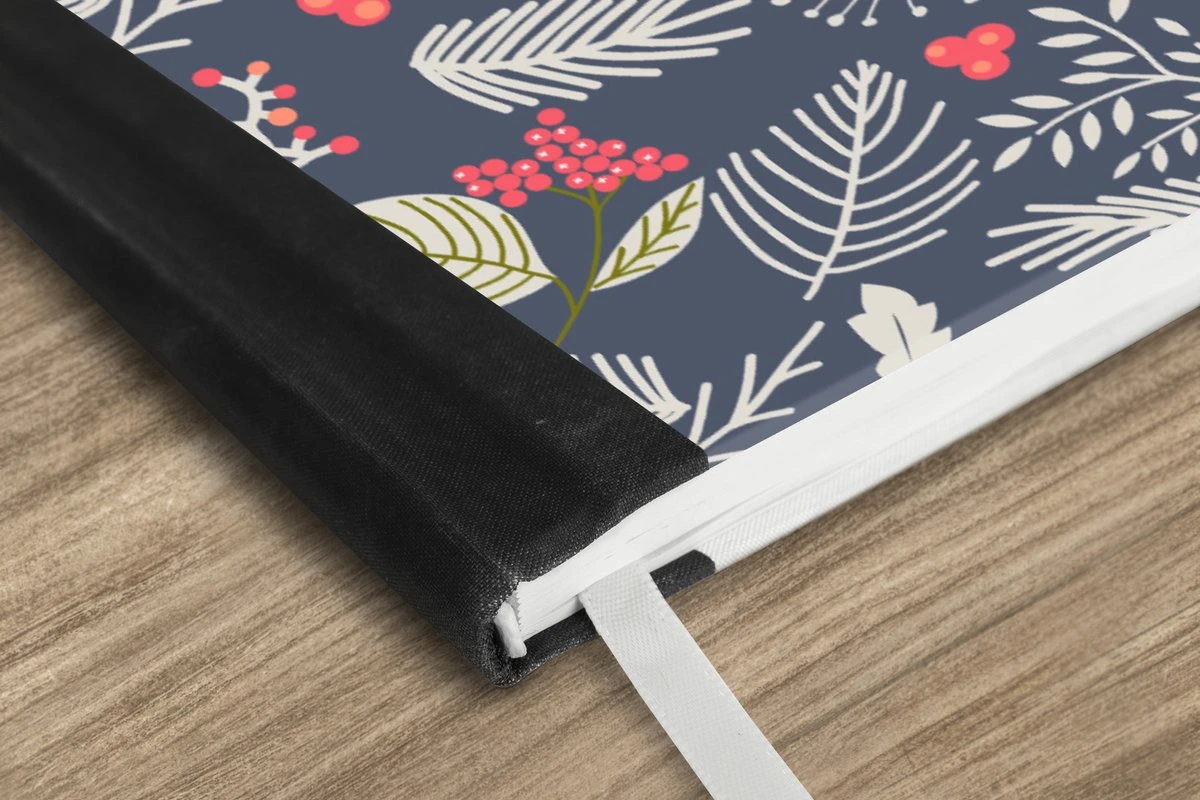 Le bloc -notes a une couverture rigide et est fini avec une reliure noire. Cette reliure a un aspect daim, ce qui lui donne un aspect luxueux. En raison de la reliure noire, le carnet a un dos partiellement noir. En raison de sa taille compacte, le carnet à couverture rigide est facile à transporter.
