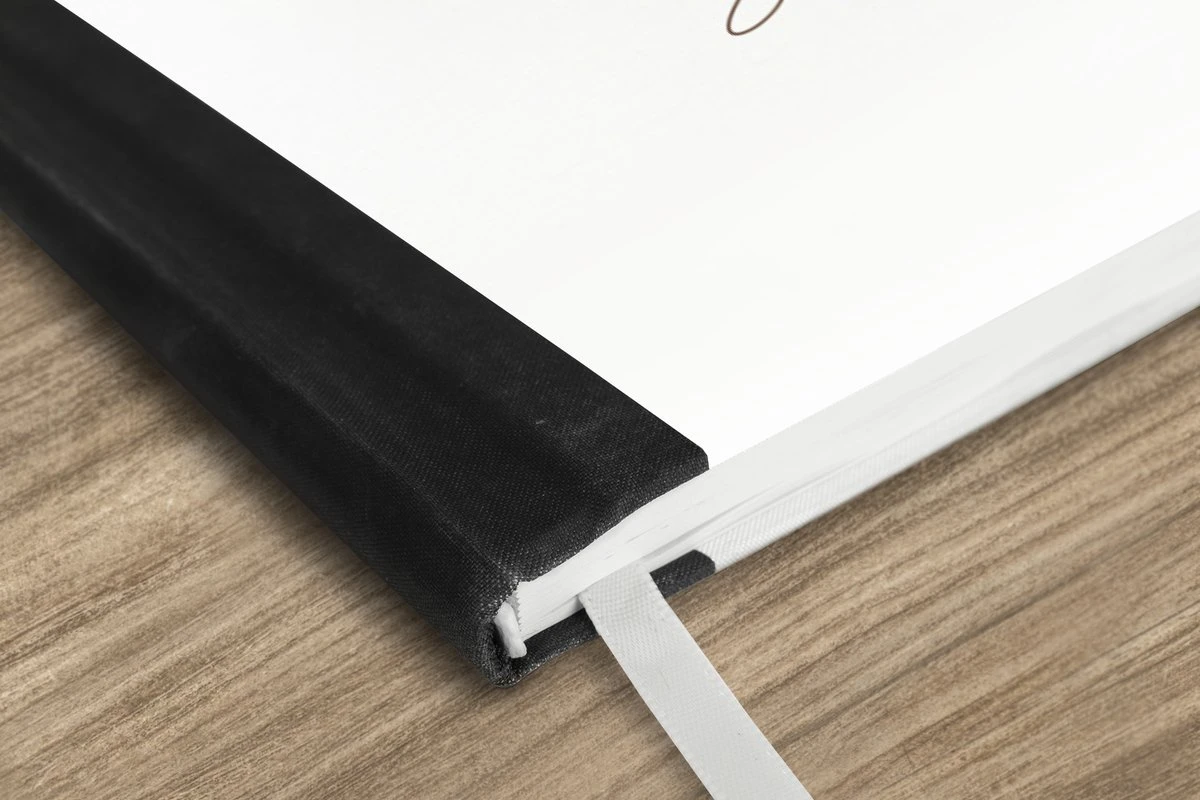 Le bloc -notes a une couverture rigide et est fini avec une reliure noire. Cette reliure a un aspect daim, ce qui lui donne un aspect luxueux. En raison de la reliure noire, le carnet a un dos partiellement noir. En raison de sa taille compacte, le carnet à couverture rigide est facile à transporter.
