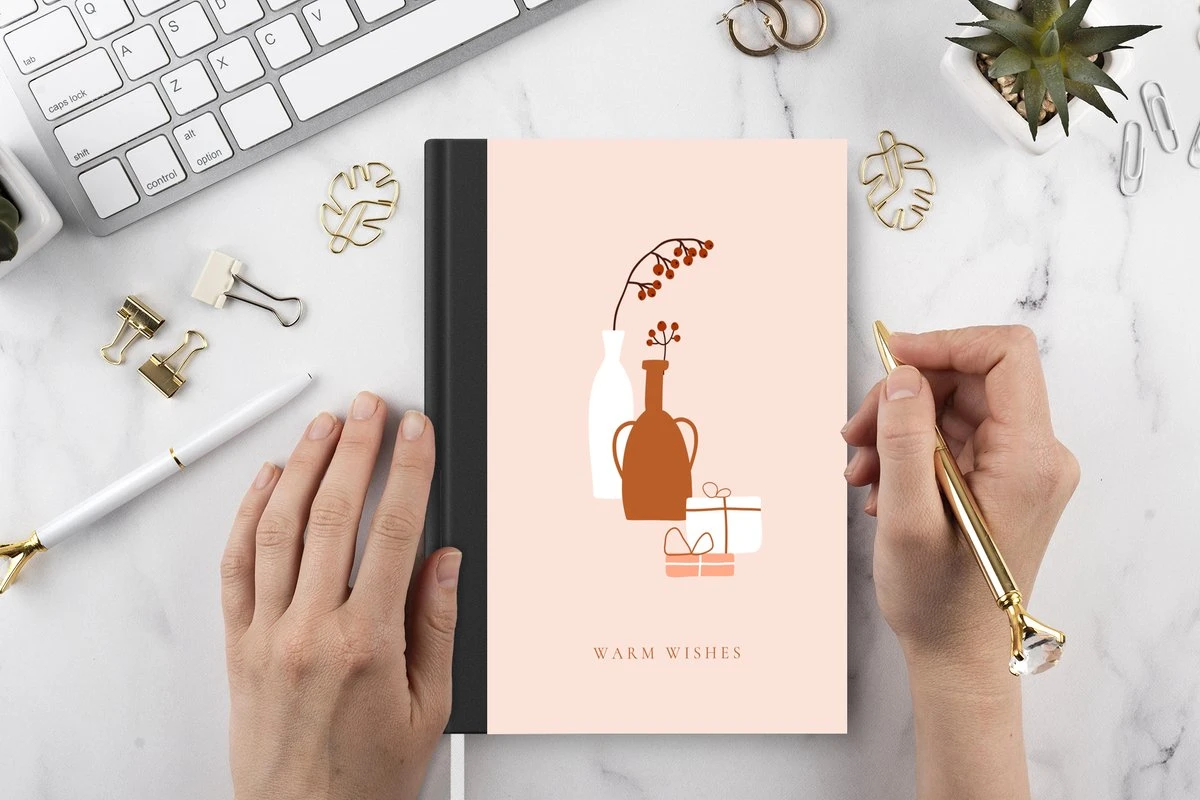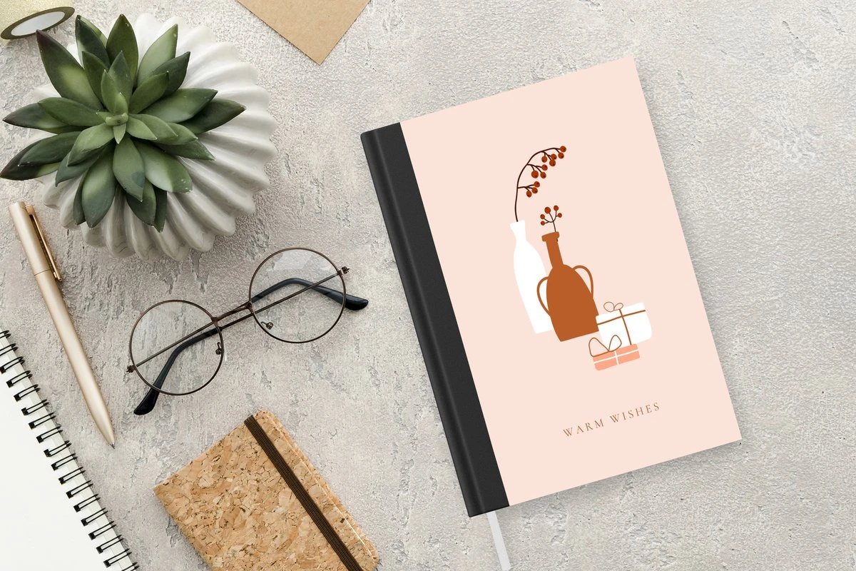 Le bloc -notes a une couverture rigide et est fini avec une reliure noire. Cette reliure a un aspect daim, ce qui lui donne un aspect luxueux. En raison de la reliure noire, le carnet a un dos partiellement noir. En raison de sa taille compacte, le carnet à couverture rigide est facile à transporter.