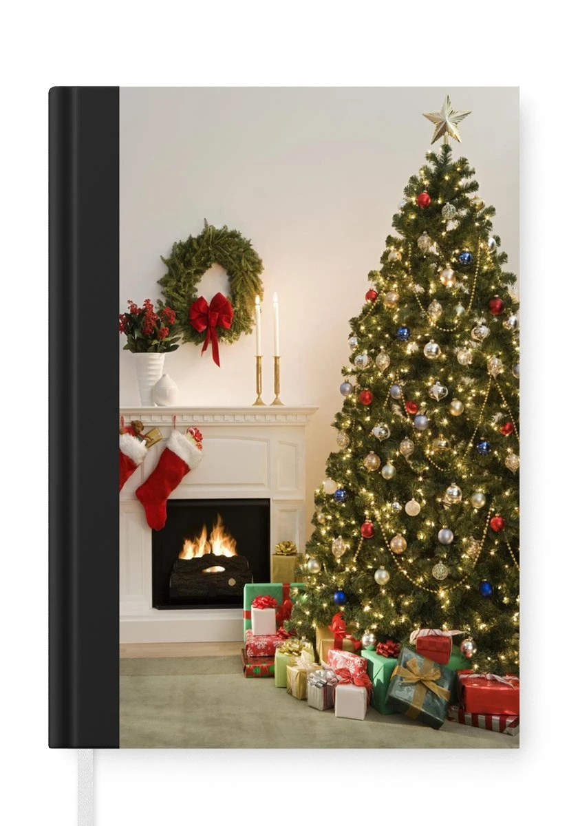 Carnet – Un sapin de Noël avec des cadeaux à côté d’une cheminée – Carnet A5