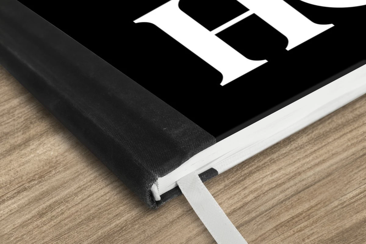Le bloc -notes a une couverture rigide et est fini avec une reliure noire. Cette reliure a un aspect daim, ce qui lui donne un aspect luxueux. En raison de la reliure noire, le carnet a un dos partiellement noir. En raison de sa taille compacte, le carnet à couverture rigide est facile à transporter.