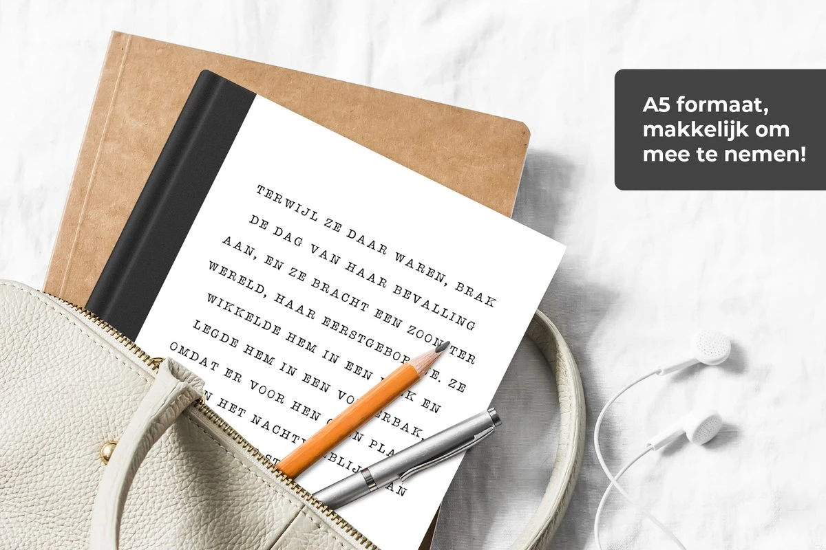 Le carnet A5 a des pages avec des lignes pré-imprimées et une barre pour régler la date. Ainsi, vous pouvez écrire vos notes proprement et de manière ordonnée. De plus, le bloc-notes contient un signet, afin que vous sachiez exactement sur quelle page vous êtes resté. Le cahier contient 98 pages. Cela vous permet d’avancer un moment avant que le livret ne soit plein !