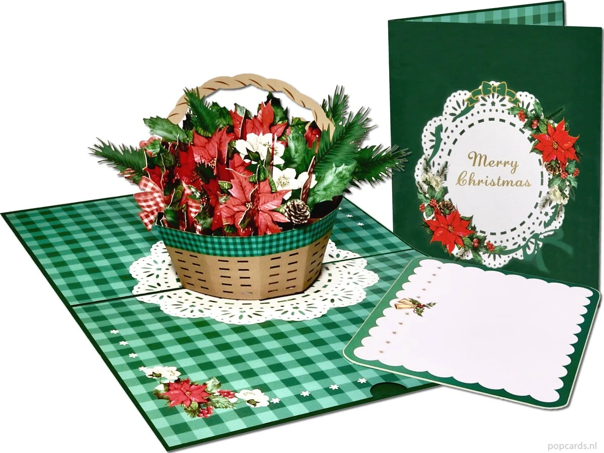 Quelle belle scène de Noël en 3D ! Cet arrangement de Noël est richement décoré de poinsettias, de pommes de pin et de branches de sapin. Inclus avec cette carte de Noël est une carte séparée, sur laquelle vous pouvez écrire vos souhaits de Noël pour l’heureux destinataire. Avec cette carte pop-up, vous apportez un beau Noël dans votre maison.