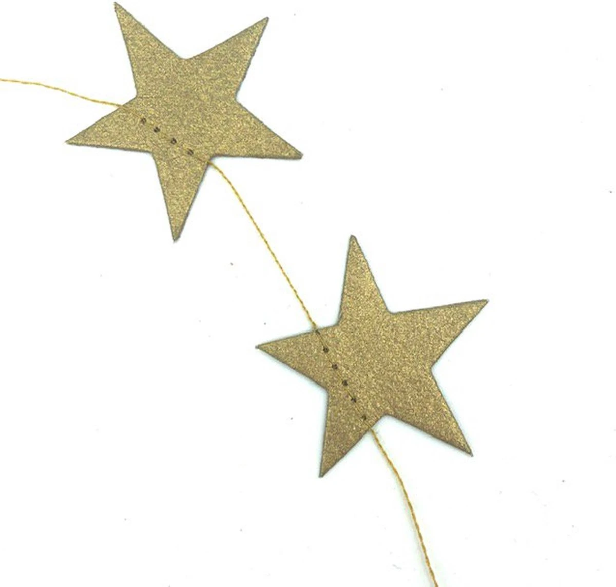 En papier éco-responsable – carte + enveloppe H18x12,5cm – guirlande d’étoiles avec coutures dorées L1,15cm – sans arbre – sans acide – colorants sans azoïques – objet de décoration – code EAN – emballé dans un polybag recyclable.
