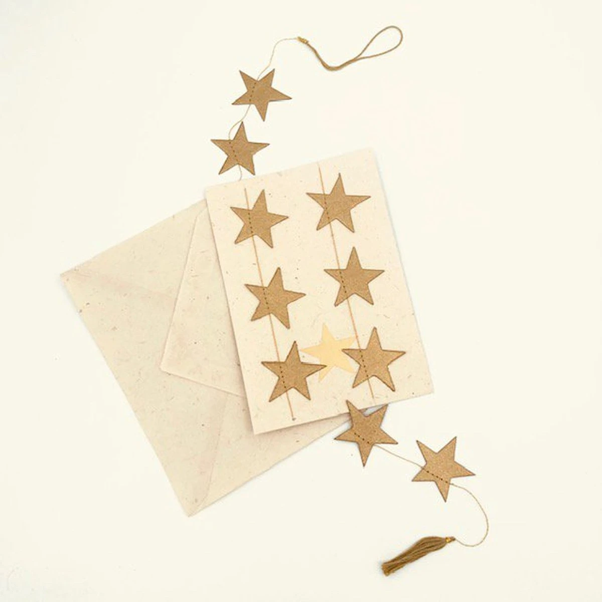 Carte + enveloppe + guirlande d’étoiles verticales dorées.