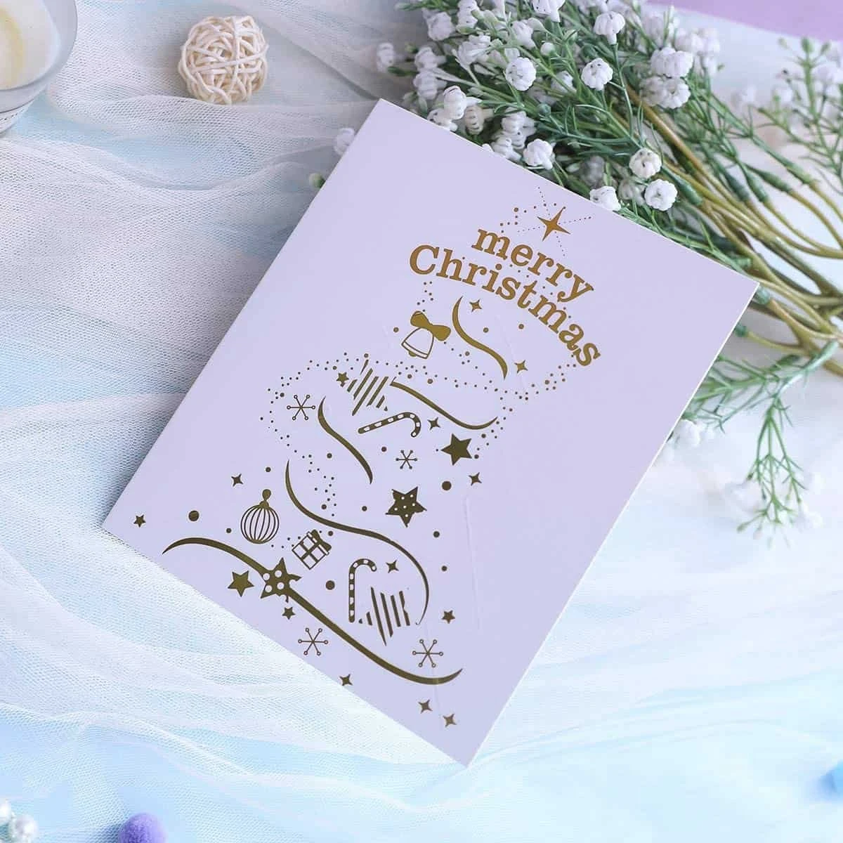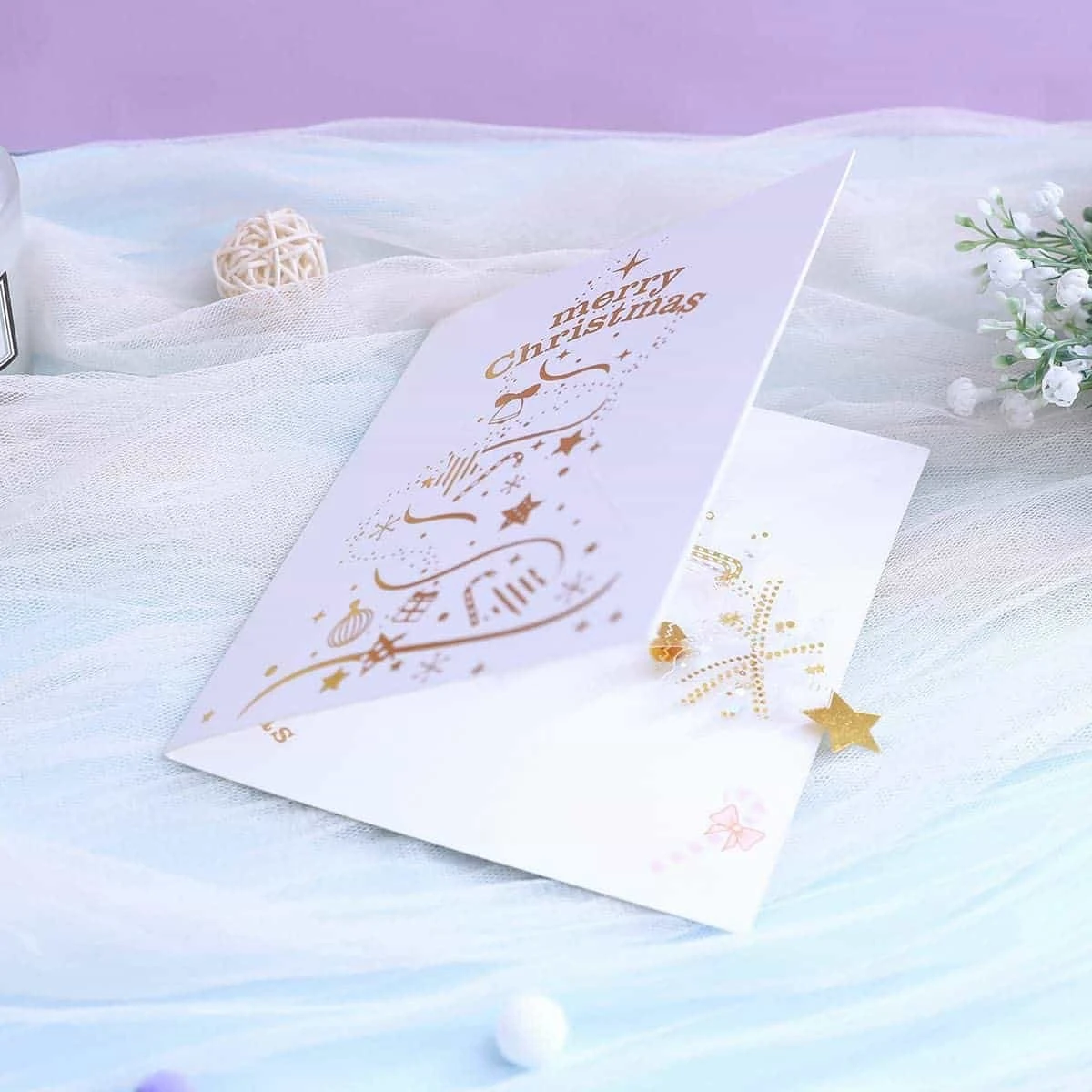 Carte de Noël Sapin de Noël. La carte est imprimée sur le devant avec des décorations dorées. Et lorsque vous ouvrez la carte, vous serez surpris par un sapin de Noël transparent rempli de boules et de guirlandes colorées. Ce qui est Heel particulier, c’est que ce sapin de Noël est en plastique transparent et que les dizaines de décorations réfléchissant la lumière dans l’arbre, en fonction de la lumière, prennent toutes sortes de couleurs scintillantes. Ce n’est pas très visible sur la photo, mais chez vous, le sapin de Noël scintille de tous les kanten dans des motifs de couleurs en constante évolution. Une carte de Noël pétillante et festive!