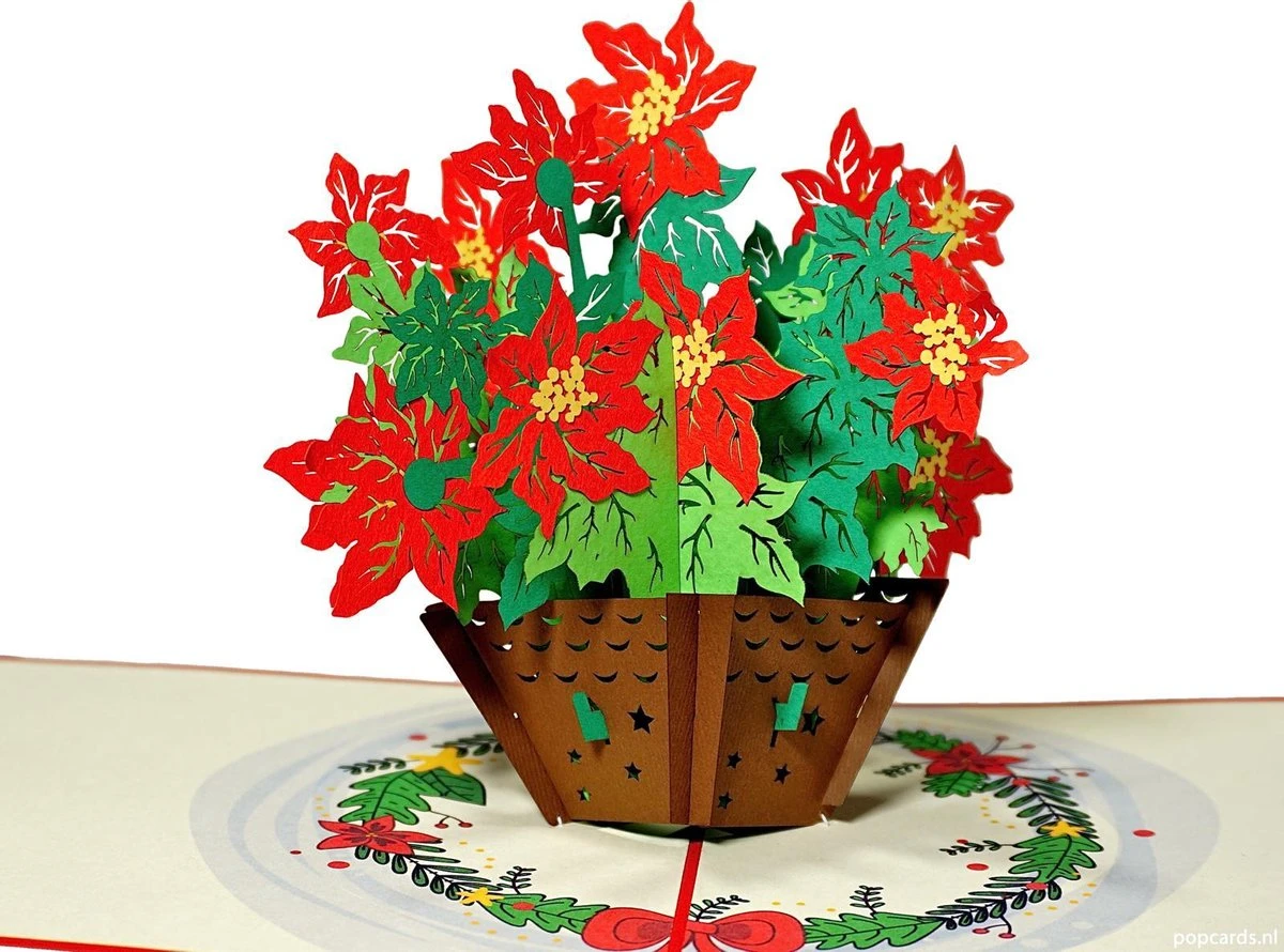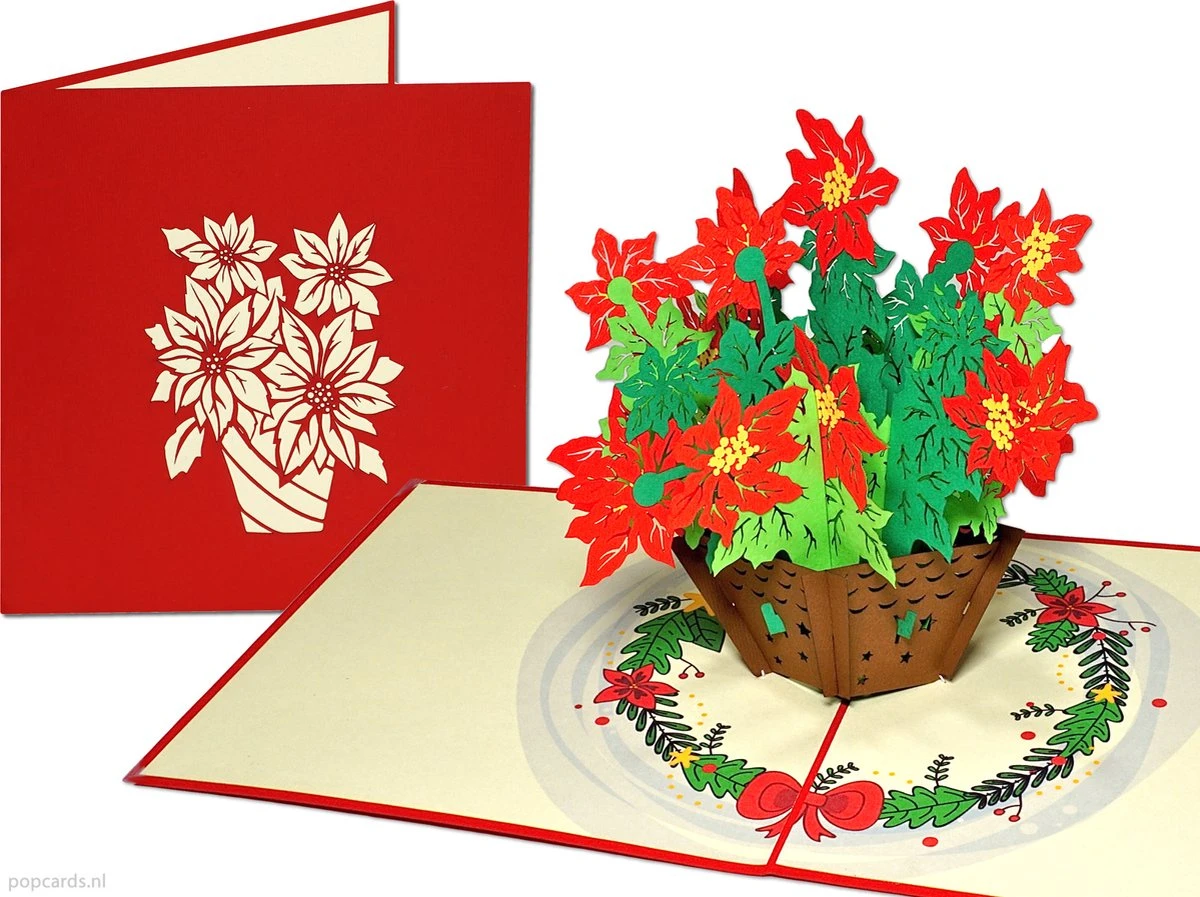 Carte de Noël de poinsettia / poinsettia. Sur le devant un pot joliment sculpté avec des poinsettias. À l’intérieur d’un bouquet coloré de pas moins de 17 roses de Noël, posé sur une belle couronne de Noël. Combien de Noël peut être mis dans une carte de Noël! Une carte chaleureuse que le destinataire conservera pendant des années et s’affichera à nouveau à Noël. Également disponible en grandes quantités.