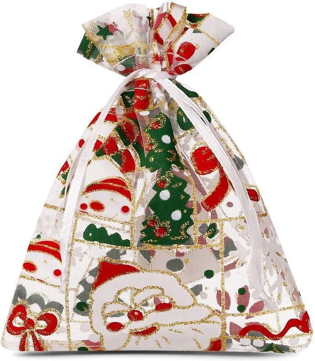 Un lot de 5 sacs en organza avec un motif de Noël. Taille 26 x 35 cm (taille extérieure). Fabriqué à partir d’organza transparent de première qualité. Chaque pochette a un cordon de serrage des deux kanten pour une ouverture et une fermeture faciles. Ces sacs se marient parfaitement avec n’importe quel style de décoration de Noël ou peuvent être utilisés comme emballage pour des cadeaux de Noël.